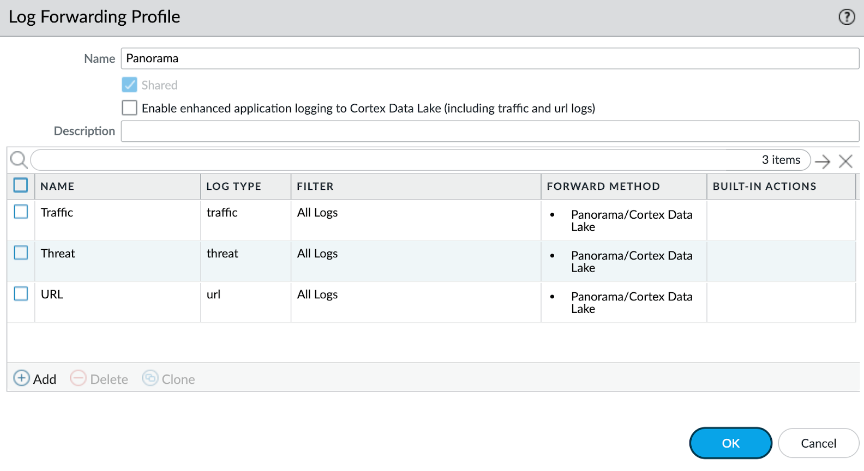 Configure the log forwarding profile. Create this profile under the Cloud Device Group and configure it to forward the required log types to Panorama.
