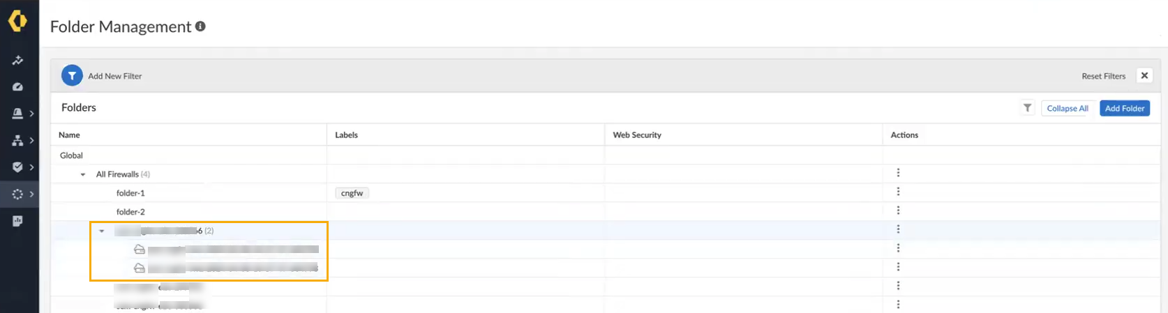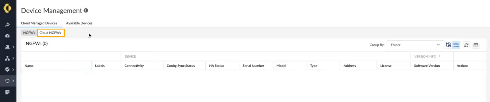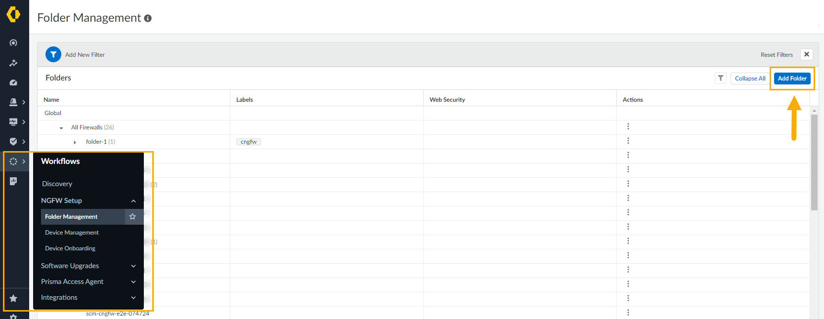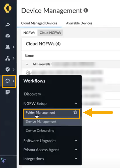 The Device Management screen groups your Cloud NGFW resources into folders. To view the structure of these folders, select Workflows > Folder Management.