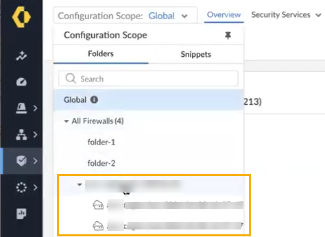 By default, the Configuration Scope displays Global firewall resources. The scope may represent the Cloud NGFW (rather than a folder). The configuration menu changes automatically to reflect available options. Ensure that device scope configuration is enabled; device scope can't support Cloud NGFW names greater than 30 characters.In the drop-down list, locate the folder containing the Cloud NGFW Azure resources: