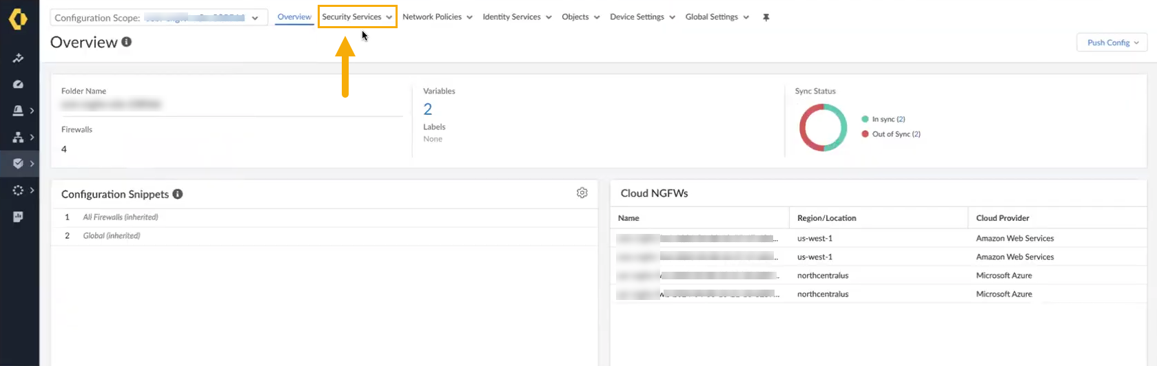 - Config sync Status. The status of the Cloud NGFW resource.When using SCM policy management for the first time, the Config sync status appears Out of Sync; after manually pushing configuration changes the status changes to reflect In sync.