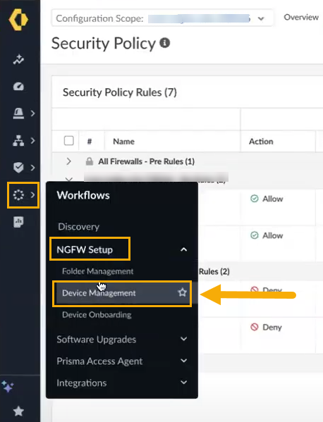 After creating your Cloud NGFW resource, you can use SCM to manage the policy.When you log into Strata Cloud Manager, the dashboard may fail to display the Cloud NGFW count under NGFW > Software. Refresh your browser to view the newly linked firewall.- Log in to the Strata Cloud Manager app from the Palo Alto Networks hub directly at stratacloudmanager.paloaltonetworks.com.Select Workflows > NGFW Setup > Device Management: