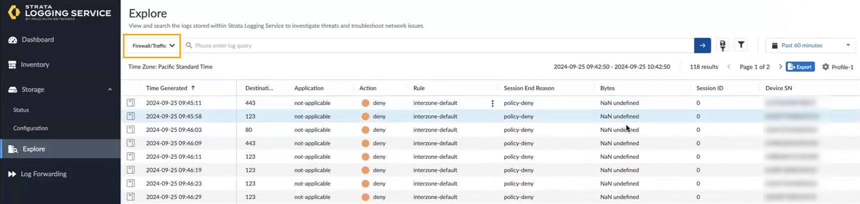 Click Explore to view and interact with logs stored in your Strata Logging Service. The Query Builder along with time range preferences help you narrow down the specific logs that are of interest to you. You can view the log details and also export all log types to a compressed CSV file in GZ format.Select Firewall/Threat from the explore drop-down to select the log you want to view.You can filter logs for your Cloud NGFW resource. For example, enter sub_typevalue=WildFire® or wildFire®virus to filter for WildFire logs. For more information, see View Strata Logging Service Logs in Explore. You can also use the filter to query the log for a specific Cloud NGFW, for example, log source group ID = your Cloud NGFW name.