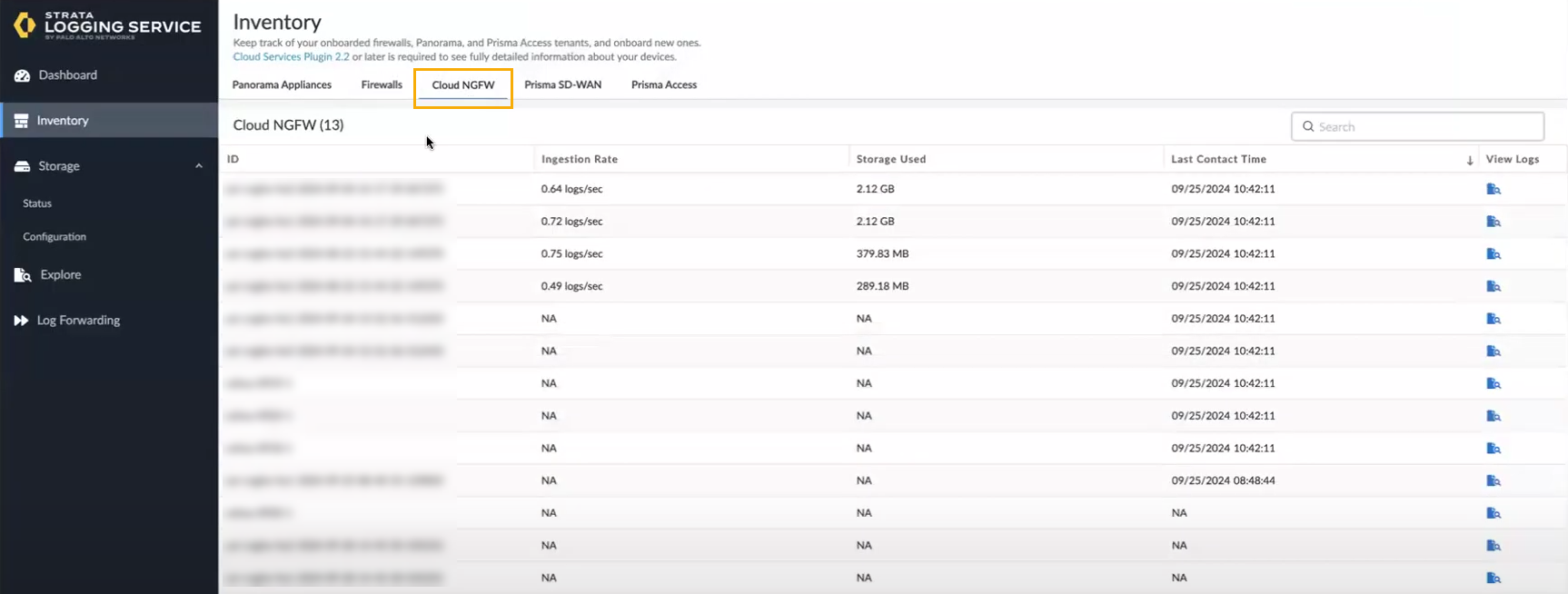 Cloud NGFW supports Strata Logging Service (formerly Cortex Data Lake), a cloud-based logging system that stores context-rich enhanced network logs generated by our security products, including our NGFWs, Prisma Access, and Cloud NGFW for AWS. With Strata Logging Service, you can collect ever-expanding volumes of data without needing to plan for local compute and storage, and it's ready to scale from the start. Learn how to activate and deploy Strata Logging Service in your product.In addition to using the Strata Logging Service, you can also use the Strata Cloud Manager Incidents and Alerts log viewer.- Launch the Strata Logging Service from the SCM console; log in to the SCM app from the Palo Alto Networks hub. In the lower left portion of the SCM interface, select the Tenant icon.Select Strata Logging Service.In the Strata Logging Service Dashboard, click Inventory. Your Cloud NGFW resource should appear.Select the Cloud NGFW tab: