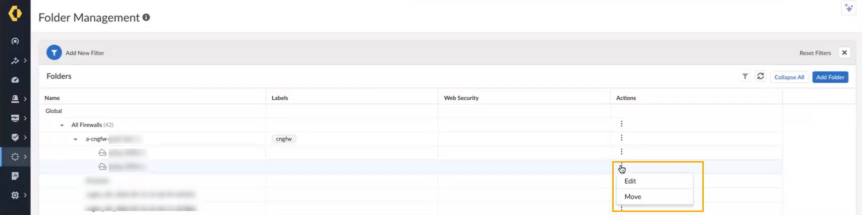 In the Create Folder screen:- Enter a descriptive name for the folder.Optionally provide a description for the folder.Optionally assign one or more labels. You can select an existing label or create a new label by typing the label you want to create. For example, use the Labels drop-down to select cngfw.Specify where to create the folder using the drop-down menu. You can select All Firewalls, or select an existing folder to nest the folder under it. This is a required field.Click Create.To move or edit the folder containing your Cloud NGFW resources to another folder:In the Folder Management screen, select the folder you want to move or edit.In the Actions column, select the vertical ellipsis to Edit or Move a folder: