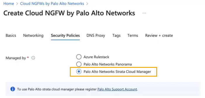 - Log in to the Azure portal and search for Cloud NGFWs by Palo Alto Networks. This displays the Cloud NGFWs you have registered with Azure. For more information, see Start with Cloud NGFW for Azure.Create a new NGFW resource.For more information on creating a new Cloud NGFW for Azure, see Deploy the Cloud NGFW in a vNET or Deploy the Cloud NGFW in a vWAN.In the Settings section, select Security Policies.You can choose Strata Cloud Manager under Security Policies when you deploy the Cloud NGFW resource.In the Security Policies tab, select Managed by Palo Alto Networks Strata Cloud Manager.