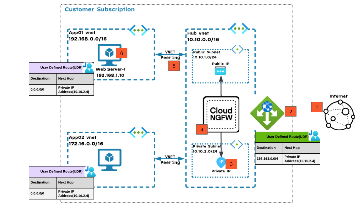 6. The web server and it uses UDR to redirect the response traffic to the Cloud NGFW for inspection.