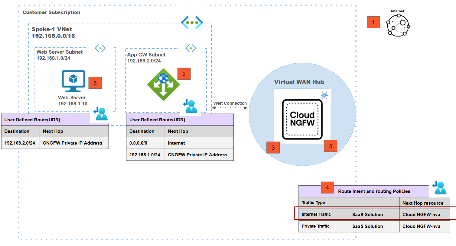 - Traffic from a the spoke1 VNet workload VM is destined for the internet.Traffic destined to the internet from the spoke-1 web server VM is forwarded to the vWAN hub using the VNet connection.Routing intent on the vWAN hub is used to redirect traffic from the vWAN hub to the Cloud NGFW.Routing intent is enabled for internet traffic with the Cloud NGFW as a next hop to redirect internet egress traffic to the Cloud NGFW for inspection.Post inspection source NAT is performed on the Cloud NGFW using the public IP address associated with the Cloud NGFW.Traffic is now sent out onto the internet.