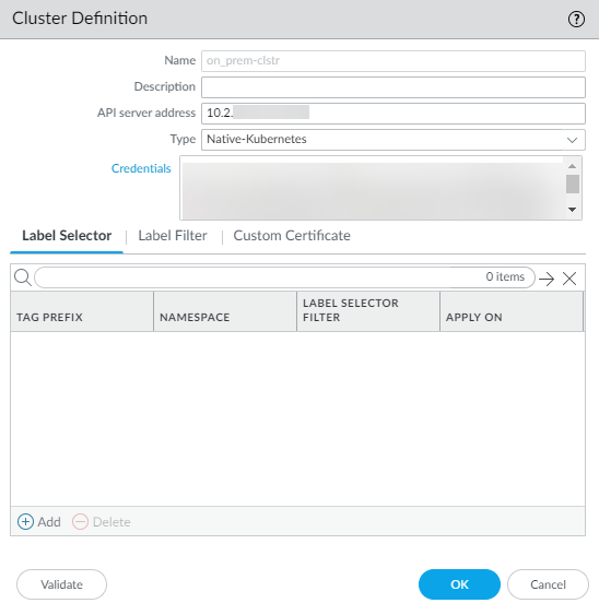 Select PanoramaPluginsKubernetesSetup Cluster, and Add Cluster.Make sure that you do not add the same Kubernetes cluster to more than one Panorama (single instance or HA pair) appliance because you may see inconsistencies in how the IP-address-to mappings are registered to the device groups.Enter a Name and the API Server Address.This is the Endpoint IP address for the cluster that you must get from your Kubernetes deployment. Enter a name, up to 20 characters, to uniquely identify the name of the cluster. You cannot modify this name because Panorama uses the cluster name when it creates tags for the pods, nodes, services it discovers within the cluster.The format of the API server address can be a hostname or an IP address:port number, and you do not need to specify the port if you are using port 443, which is default port.Select the Type of environment on which your cluster is deployed.The available options are AKS, EKS, GKE, Native Kubernetes, OpenShift, and Other.Upload the service account Credential that Panorama requires to communicate with the cluster. As described in the create service accounts for cluster authentication workflow, the filename for this service account is plugin-svc-acct.json.If you are uploading the service credentials via CLI/API then you must gzip the file and then do a base64 encoding of the compressed file before you upload or paste the contents of the file into the Panorama CLI or API. These steps are not required if you are uploading the service credential file on the GUI.Click OK.You can leave the Label Filter and Label Selector configuration for later. This is an optional task that enables you to retrieve any custom or user-defined labels for which you want Panorama to create tags.