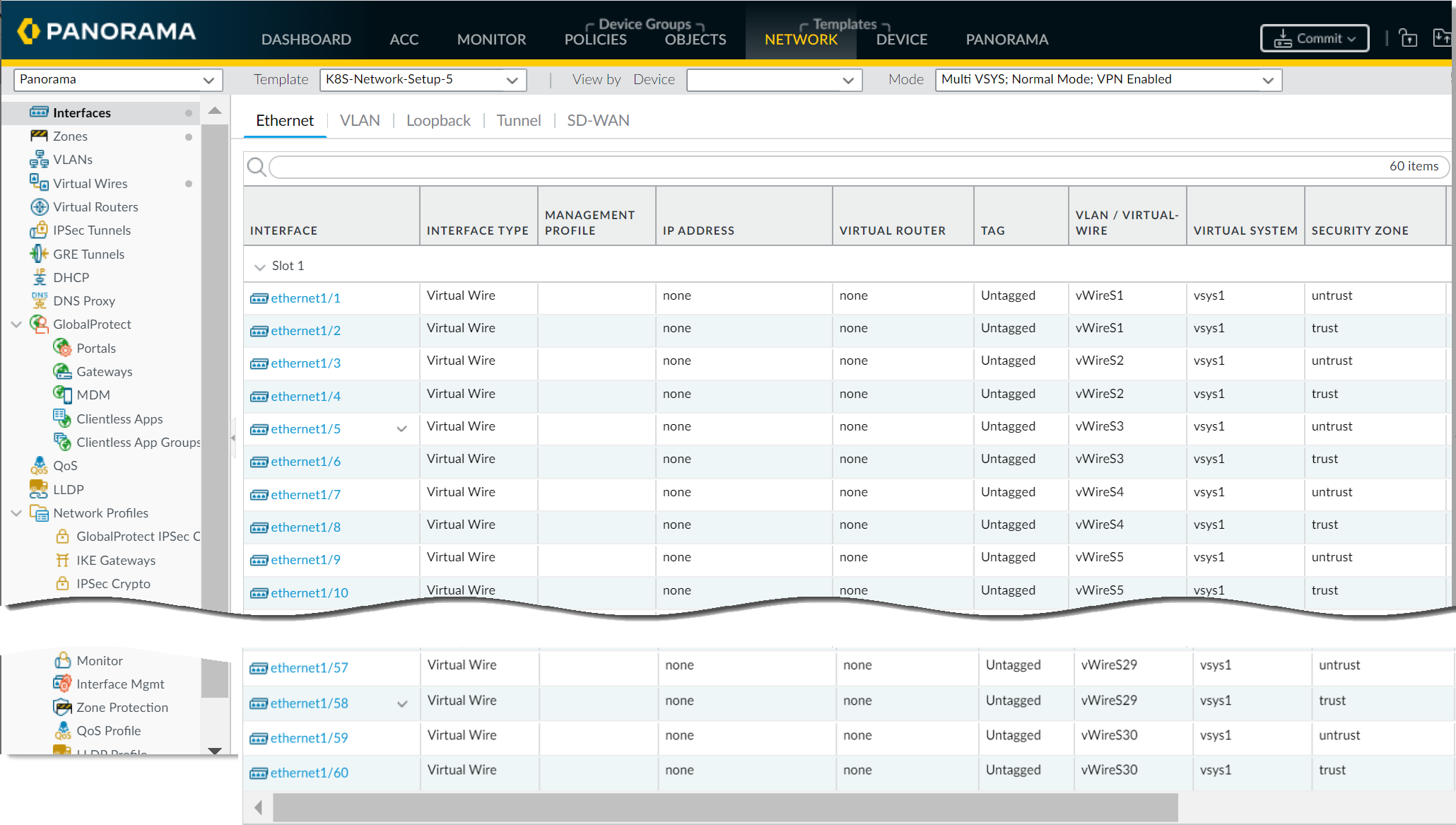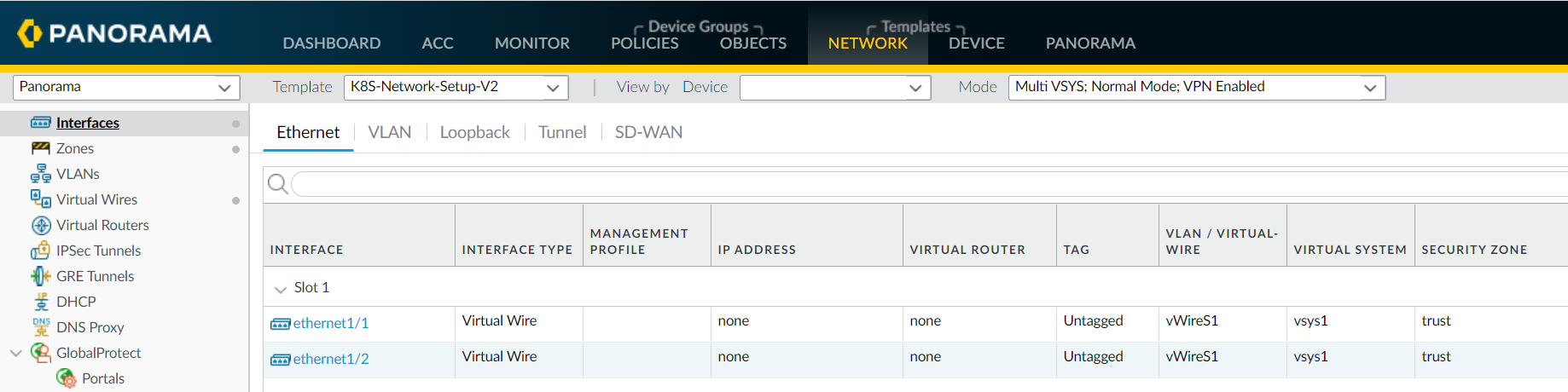 Commit your changes on Panorama.Click Commit to Panorama. The commit creates four templates—K8S-Network-Setup, K8S-Network-Setup-V2, K8S-Network-Setup-V3, and K8S-Network-Setup-V3-HA. It can take up to one minute for the interfaces to display on Panorama.- K8S-Network-Setup is for use with the CN-Series as a DaemonSet and has 30 virtual wires; a pair of interfaces that are part of a virtual wire to secure an application. Therefore, the CN-NGFW as a DaemonSet can secure a maximum of 30 application pods on a node.