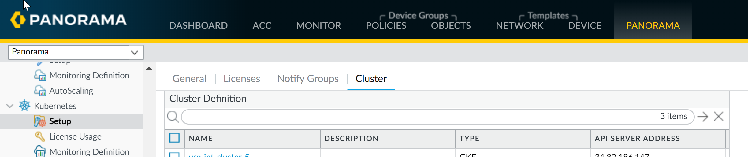 Set up the Kubernetes plugin for monitoring the clusters.The next step in the process is to add Kubernetes cluster information to Panorama to ensure that the two can communicate with each other.Panorama supports up to 32 Kubernetes clusters.To ensure that the plugin and the Kubernetes clusters are in sync, the plugin polls the Kubernetes API server at a configured interval and listens for notifications from the Kubernetes Watch API at a predefined interval.After you add the cluster information, Panorama always retrieves the service, node, replica set, and then creates tags for them to enable you to gain visibility and to control traffic to and from these clusters. Optionally, you can specify whether you want Panorama to retrieve information on the Kubernetes labels and create tags for these also. See IP-Address-to-Tag Mapping of Kubernetes Attributes for a list of supported attributes.- Check the monitoring interval.The default interval at which Panorama polls the Kubernetes API server endpoint is 30 seconds.