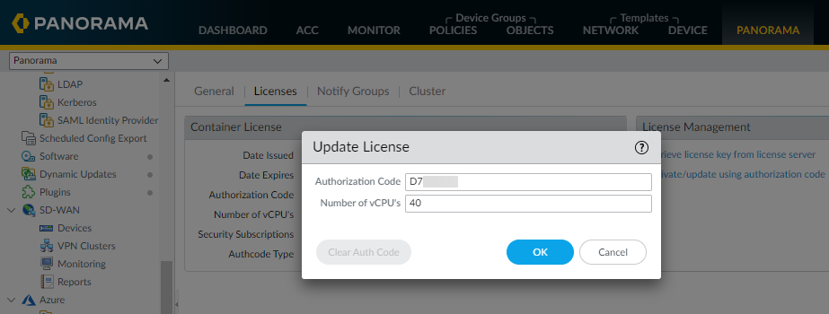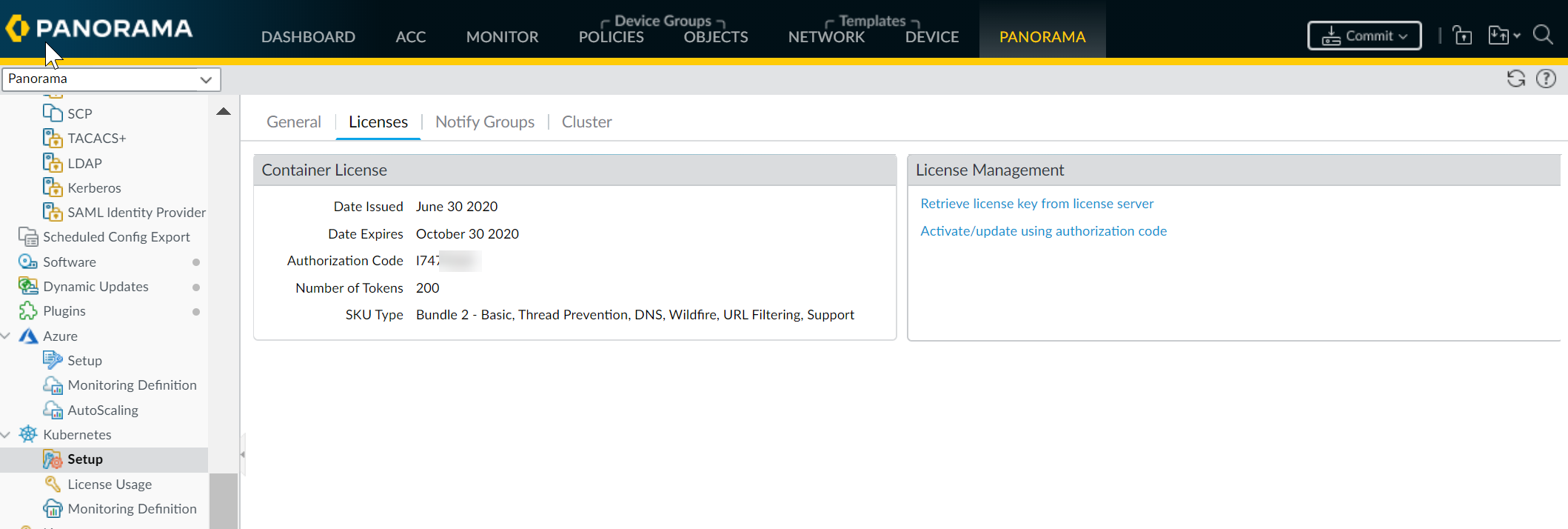 Get the CN-Series license credits on Panorama.- Select PanoramaPluginsKubernetesSetupLicenses.Select Activate/update using authorization code, and enter the auth code and the total number of dataplane vCPUs needed. You must Create and Manage a Deployment Profile to activate CN-Series License to obtain your CN-Series authcode.