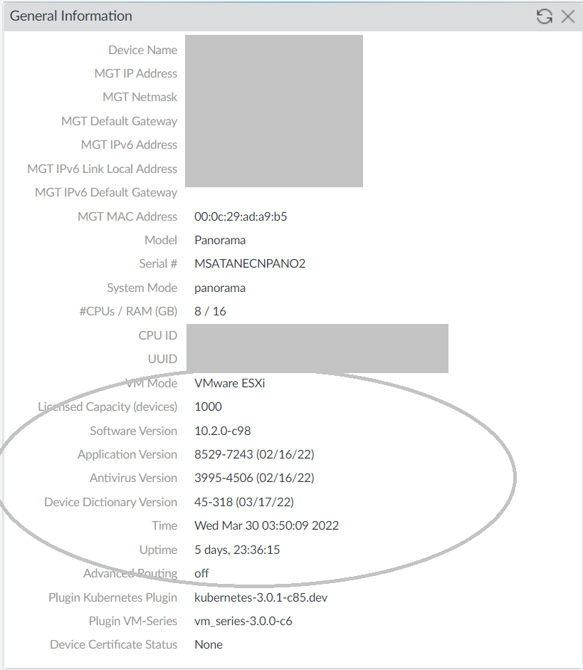 - Go to PanoramaDynamic Updates for the minimum content release version on PAN-OS 11.0.See PAN-OS Release Notes.Go to PanoramaSoftware for the software version.Locate and download the model-specific file for the release version to which you are upgrading. For example, to upgrade an M-Series appliance to Panorama 11.0, download the Panorama_m-11.0.0 image; to upgrade a Panorama virtual appliance to Panorama 11.0.0, download the Panorama_pc-11.0.0 image.After a successful download, the Action column changes from Download to Install for the downloaded image.Verify that your Panorama is in Panorama mode, if you want Panorama to collect the firewall logs.Install the Kubernetes plugin on Panorama. If your Panorama appliances are deployed as an HA pair, you must install the Kubernetes plugin on the primary (active) peer first.