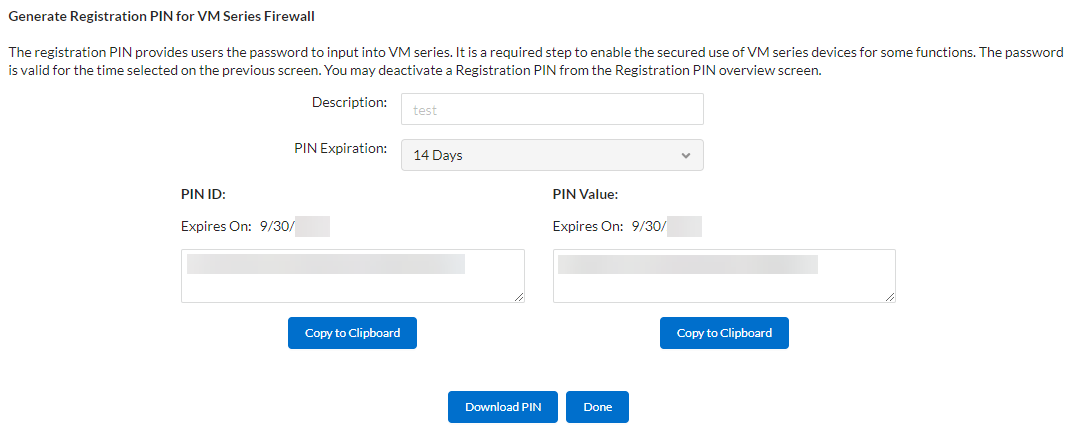 Save the PIN ID and value.Save the PIN ID and value. This PIN ID and value are inputs in the pan-cn-mgmt-secret.yaml file used to deploy the cn-series firewall. Make sure to launch the firewall before the PIN expires.# Thermite Certificate retrieval CN-SERIES-AUTO-REGISTRATION-PIN-ID: "<your-pin-id>" CN-SERIES-AUTO-REGISTRATION-PIN-VALUE: "<your-pin-value>"