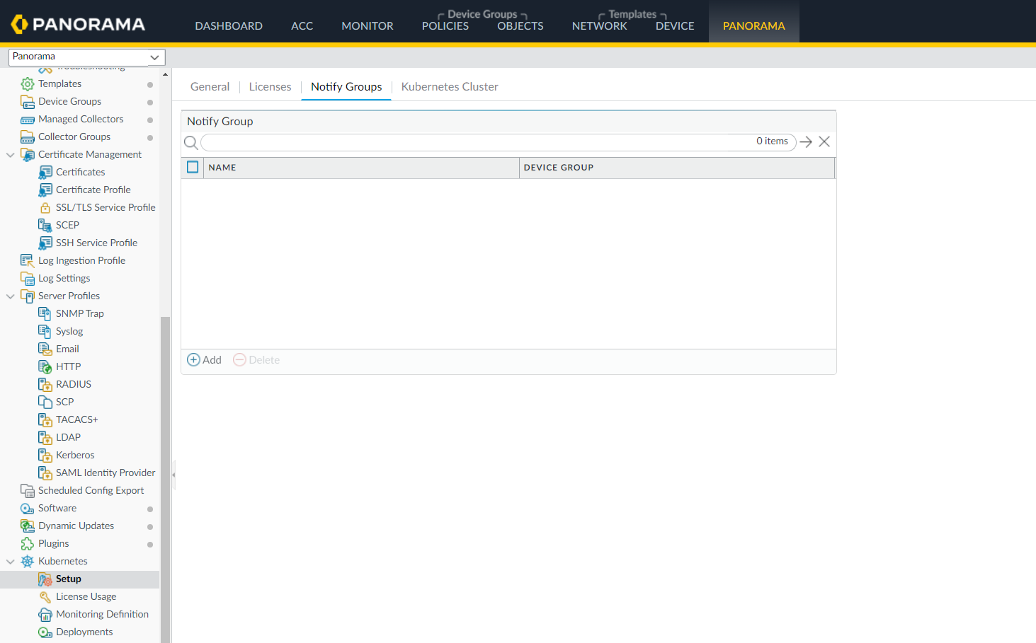 1. Select Panorama > Plugins > Kubernetes > Setup > Notify Groups, and Add.