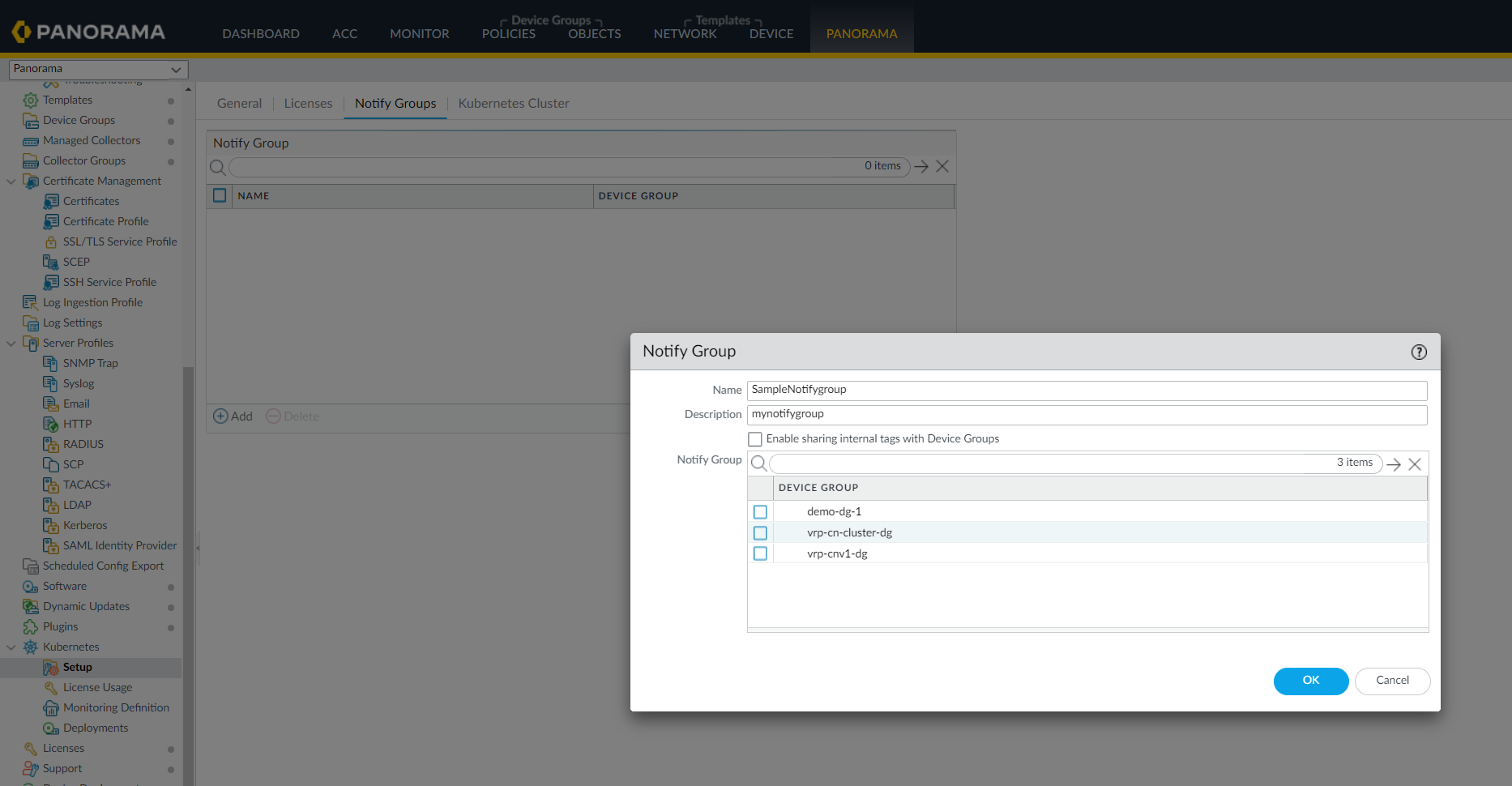 Perform the following steps to create a Notify Group in the Panorama Kubernetes plugin: