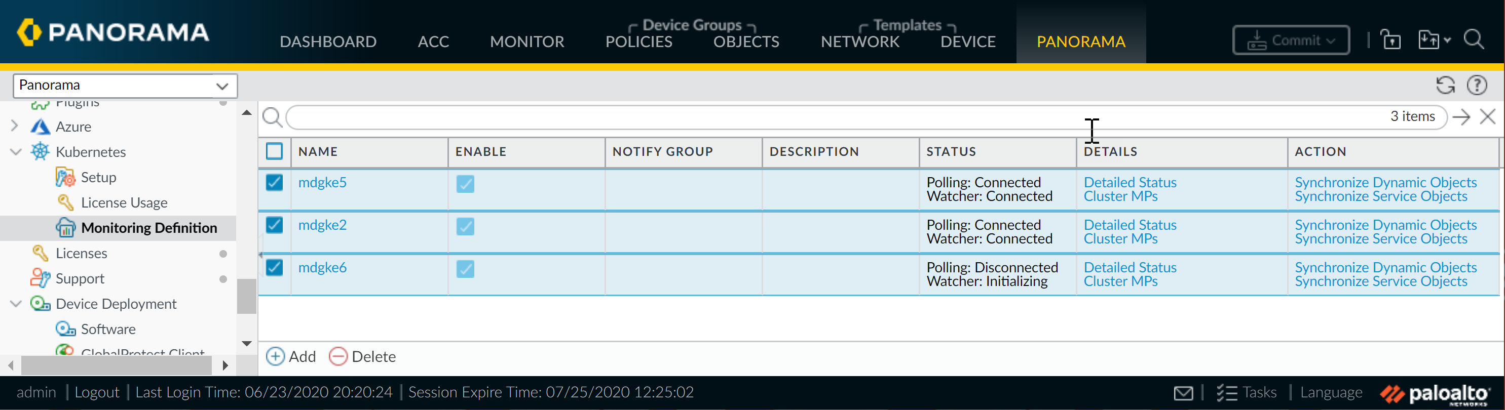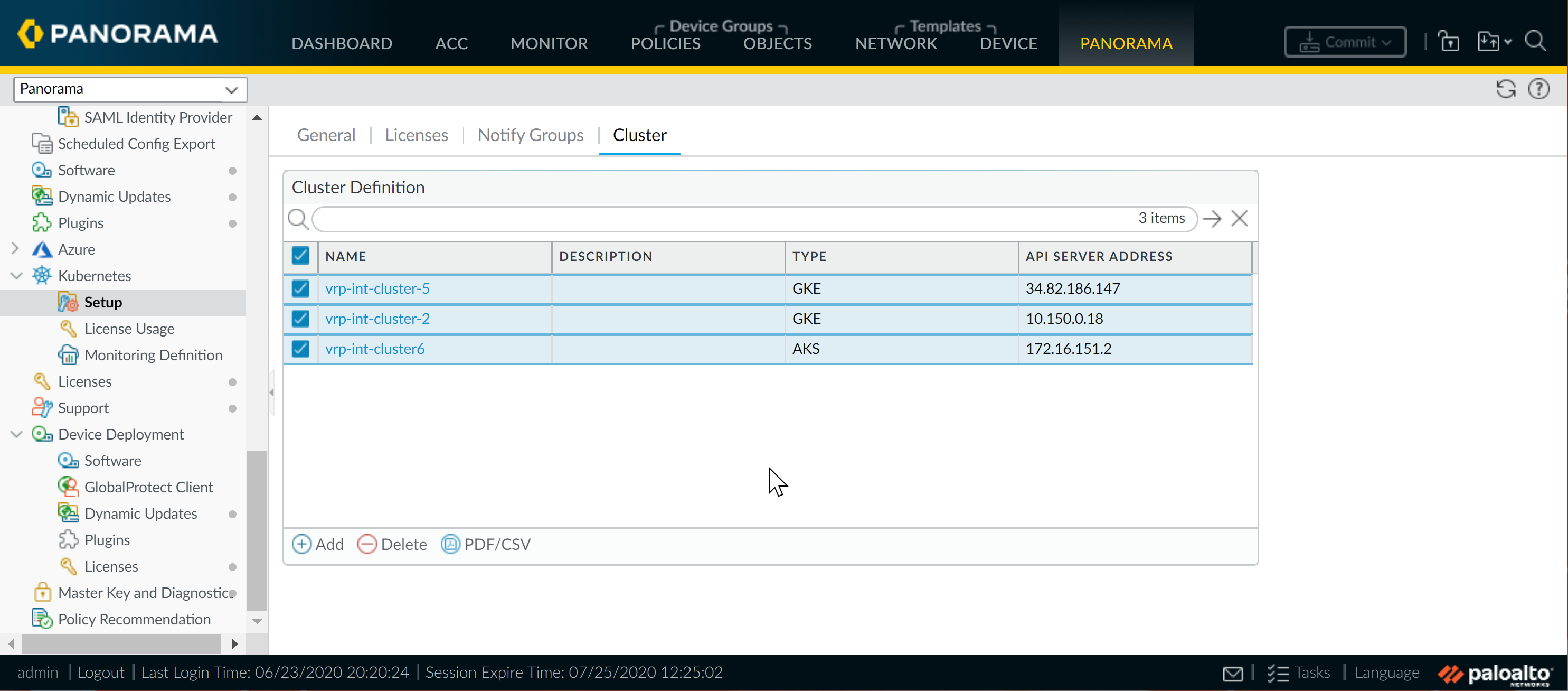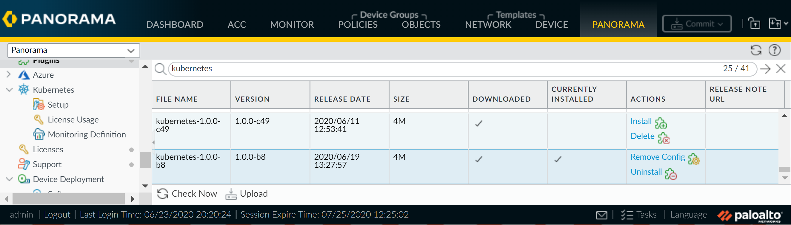 Commit your changes on Panorama.CommitCommit to Panorama.Verify that the used tokens count is zero.To confirm that all the tokens are returned back to the licensing server.Perform a clear authcode and make sure the license column authcode is None.Remove configuration and commit your changes.- Select Plugins and find the Kubernetes plugin version you have installed, and Remove Config.