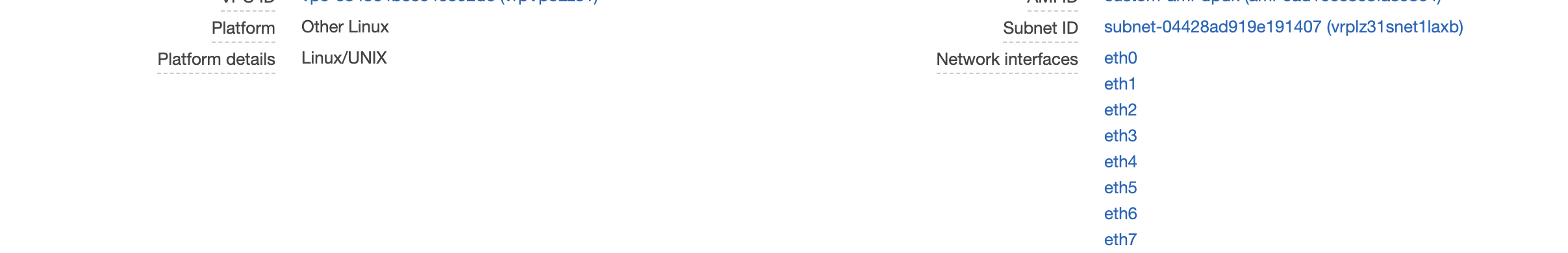 - On the workernode, retrieve the pciBusID value from the hypervisor interface by running the following command:lspci | grep -i etherFor example:00:05.0 Ethernet controller: Amazon.com, Inc. Elastic Network Adapter (ENA)00:06.0 Ethernet controller: Amazon.com, Inc. Elastic Network Adapter (ENA)00:07.0 Ethernet controller: Amazon.com, Inc. Elastic Network Adapter (ENA)00:08.0 Ethernet controller: Amazon.com, Inc. Elastic Network Adapter (ENA)00:09.0 Ethernet controller: Amazon.com, Inc. Elastic Network Adapter (ENA)00:0a.0 Ethernet controller: Amazon.com, Inc. Elastic Network Adapter (ENA)00:0b.0 Ethernet controller: Amazon.com, Inc. Elastic Network Adapter (ENA)00:0c.0 Ethernet controller: Amazon.com, Inc. Elastic Network Adapter (ENA)The PCI ordering is same as ordering of the eth interfaces as shown on AWS EC2 UI