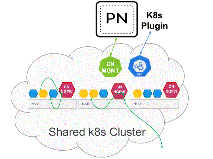 When deployed as a Kubernetes Service, instances of the CN-NGFW can be deployed on security nodes and application pod traffic is redirected to an available CN-NGFW instance for inspection and enforcement.
