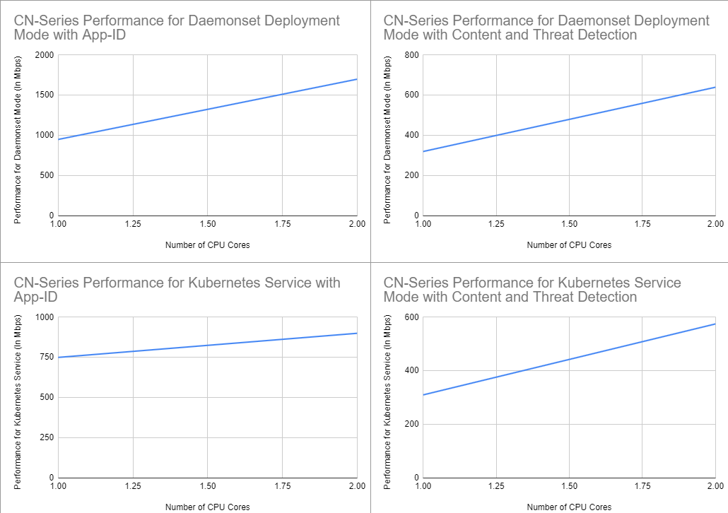 | CPU Cores | CN-Series as a DaemonSet (MMAP) | CN-Series as a Kubernetes Service (MMAP) | CN-Series as a Kubernetes CNF (MMAP) | |