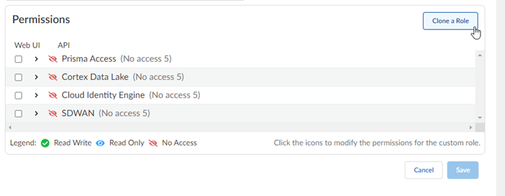 5. Select between predefined roles or custom roles that the Tenant Service Group (TSG) has previously created or inherited, and Clone a Role.