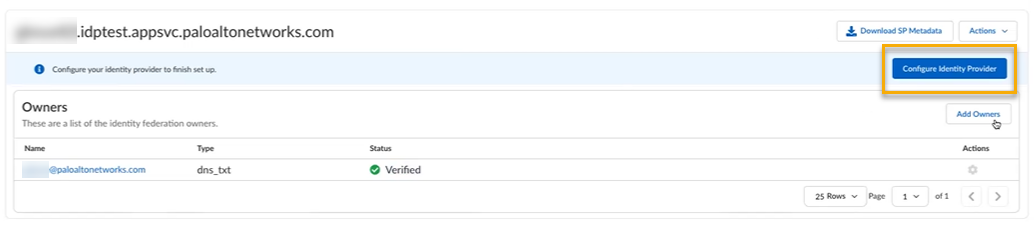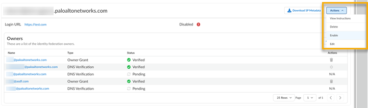 8. The Configure Identity Provider button is replaced with the Login URL. The Login URL is how Palo Alto Networks knows where to send the user when they log in. This is disabled by default. Select ActionsEnable.