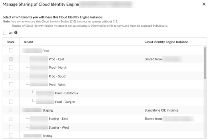 After you activate Cloud Identity Engine on a tenant and add child tenants, you can share