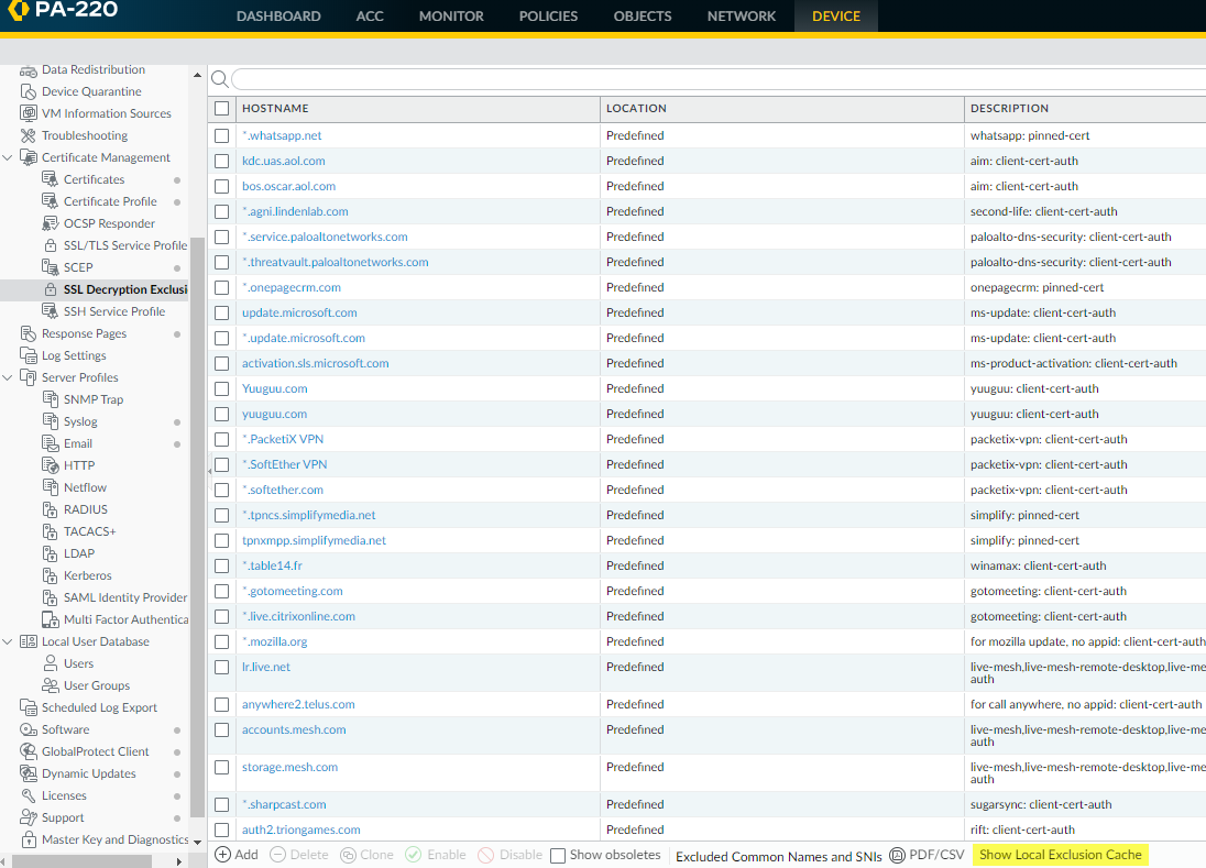 (PAN-OS and Panorama) Select DeviceCertificate ManagementSSL Decryption Exclusion, and then click Show Local Exclusion