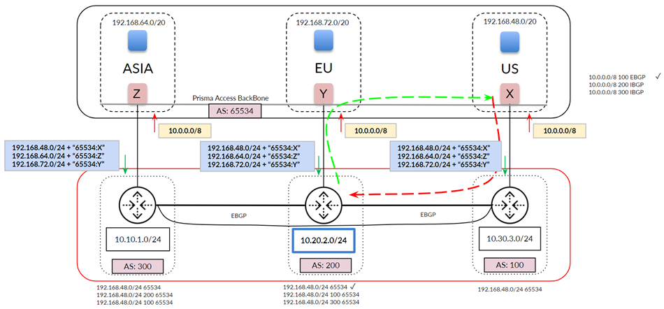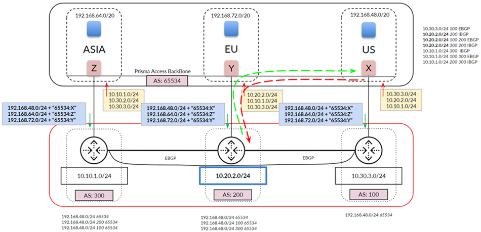 - Prisma Access advertises mobile user routes in and adds BGP community values in the routes it advertises through the service connection. The following figure shows a mobile user deployment with three service connections and three different IP address blocks specified for the : 192.168.64.0/20 for the Asia, Australia & Japan region, 192.168.72.0/20 for the Africa, Europe & Middle East region, and 192.168.48.0/20 for the North America & South America region. Prisma Access divides these routes into block of /24 and advertises them with an Prisma Access’ AS number of 65534, but also appends the BGP community values to the advertisements (Z for Asia, Y for EU, and X for US). Those routes are shown in the middle of the figure. In this way, you can differentiate service connections in your network, even though Prisma Access assigns the same AS number to them.