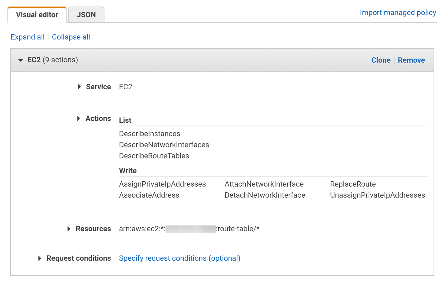 { "Statement": [ { "Action": [ "ec2:AttachNetworkInterface", "ec2:DetachNetworkInterface", "ec2:DescribeInstances", "ec2:DescribeNetworkInterfaces", "ec2:AssignPrivateIpAddresses", "ec2:AssociateAddress", "ec2:DescribeRouteTables" ], "Effect": "Allow", "Resource": [ "*" ], "Sid": "VisualEditor0" }, { "Action": "ec2:ReplaceRoute", "Effect": "Allow", "Resource": "arn:aws:ec2:*:*:route-table/*", "Sid": "VisualEditor1" } ], "Version": "2012-10-17"}