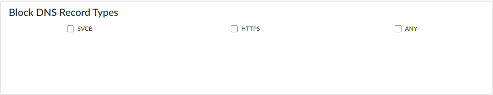 (Optional) Block the specified DNS resource record types record types used to exchange keying information during the encryption of the client hello in the subsequent TLS connection. The following DNS RR types are available: SVCB (64), HTTPS (65), and ANY (255).- While it is not necessary to block ECH in order to enable DNS Security over DoH, Palo Alto Networks currently recommends blocking all DNS record types used by ECH for optimum security. To block all DNS record types, you must select each of the Block DNS Record Types: SVCB, HTTPS, and ANY.