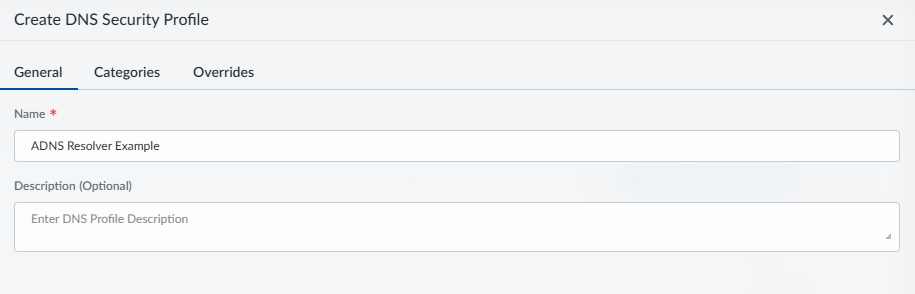 2. Select Create DNS Security Profile and in the General tab, provide a name and description for the security profile.
