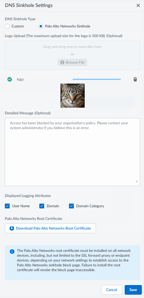 1. (Optional) For custom block pages, specify an image (up to 500kb), the logging attributes associated with the blocked domain request, and message for the block page.