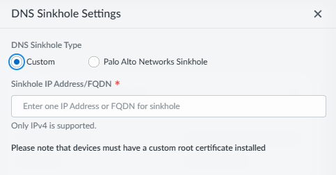 Custom DNS sinkhole servers must have an IPv4 address and a custom root certificate.