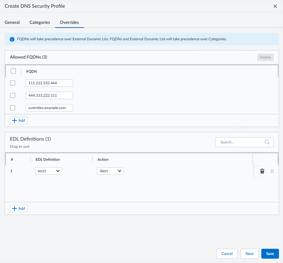 3. In the Overrides tab, add domains to an allow list. If your organization uses third party threat feeds as part of a comprehensive threat intelligence solution, you can also reference those in the form of external dynamic lists (EDLs) as part of your overrides configuration.