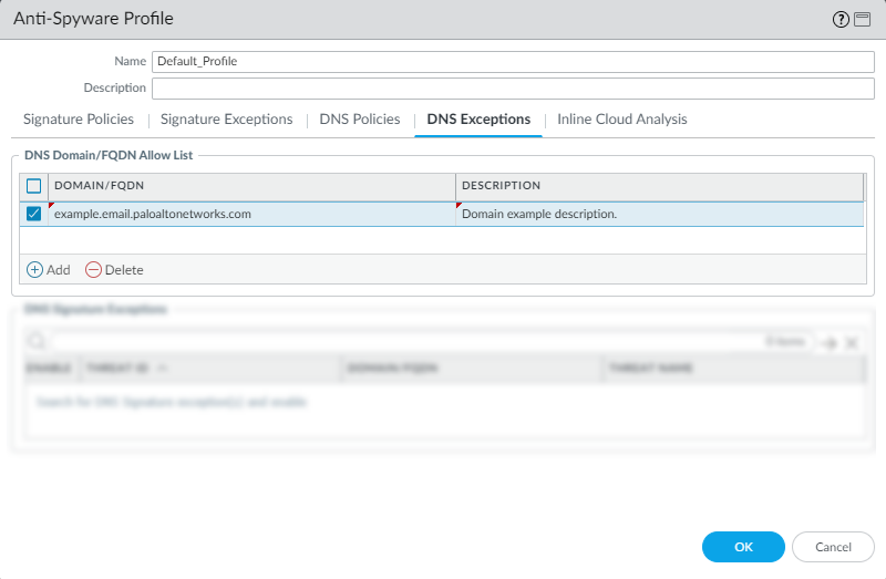 Click OK to save your new or modified Anti-Spyware profile.Add an allow list to specify a list of DNS domains / FQDNs to be explicitly allowed.- Select ObjectsSecurity ProfilesAnti-Spyware.Select a profile to modify.Add or modify the Anti-Spyware profile from which you want to exclude the threat signature, and select DNS Exceptions.To Add a new FQDN allow list entry, provide the DNS domain or FQDN location and a description.