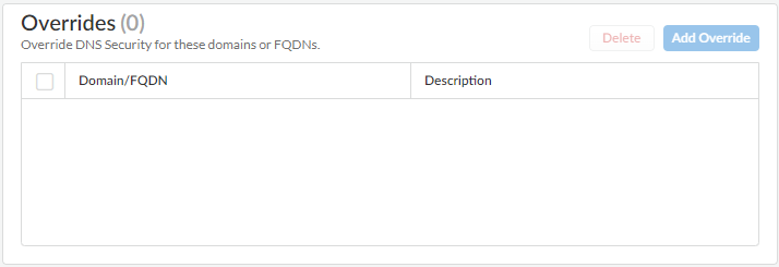 - Select ConfigurationNGFW and Prisma AccessSecurity ServicesDNS Security and select a DNS Security profile to modify.Add Override or Delete to modify the domain list entries as necessary. Each additional entry requires the domain and a description.