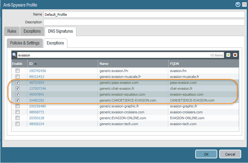 - Select ObjectsSecurity ProfilesAnti-Spyware.Select a profile to modify.Add or modify the Anti-Spyware profile from which you want to exclude the threat signature, and select DNS Signatures > Exceptions.Search for a DNS signature to exclude by entering the name or FQDN.Select the DNS Threat ID for the DNS signature that you want to exclude from enforcement.