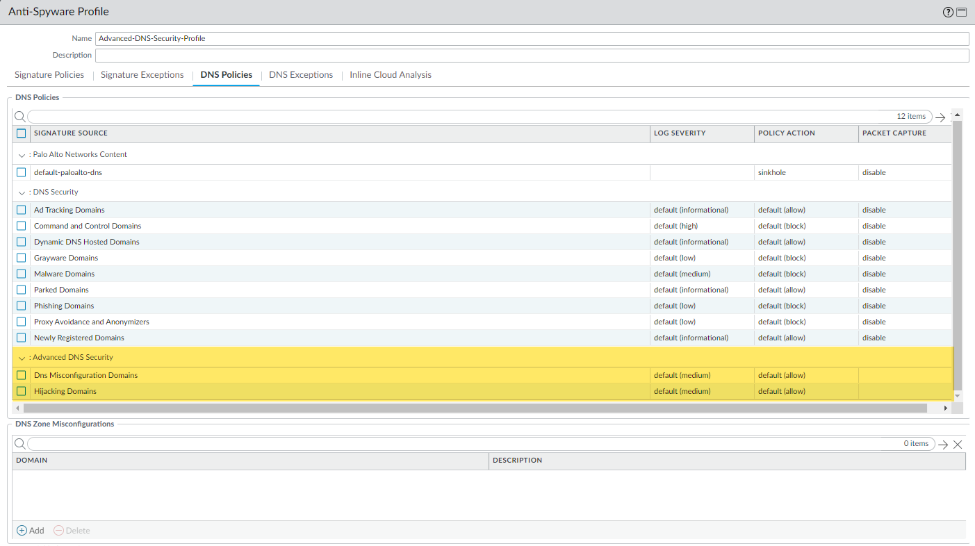 - Select your Anti-Spyware security profile and then go to DNS Policies.