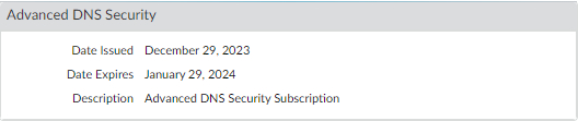 - Log in to the NGFW.Update the content release version to 8832 or later.To prevent access to known and unknown malicious domains using Advanced DNS Security, you must have an active Advanced DNS Security license. This should only be installed after upgrading to PAN-OS 11.2.Advanced DNS Security supports a licensing model that subsumes DNS Security functionality into the Advanced DNS Security license when installed on a previously unlicensed firewall. If you upgrade from a firewall with an existing DNS Security license, entries indicating the presence of separate DNS Security and Advanced DNS Security licenses are displayed. In this instance, the DNS Security license is a passive entry and all DNS Security and Advanced DNS Security functionality is conferred through the Advanced DNS License, including the relevant expiration date. Firewalls without a previously installed DNS Security license show an Advanced DNS Security license, however, it provides both DNS Security and Advanced DNS Security functionality.Consequently, if you downgrade from a PAN-OS release operating an Advanced DNS Security license to a release that does not support Advanced DNS Security, the firewall continues to display and confer DNS Security functionality through the Advanced DNS Security license, however, it is limited to base DNS Security features.To verify subscriptions for which you have currently-active licenses, select DeviceLicenses and verify that the appropriate licenses are available and have not expired.