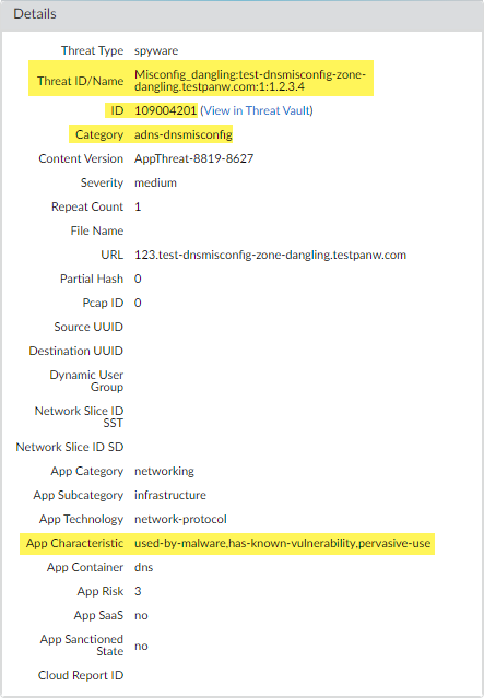 If the DNS query does not complete within the specified timeout period for Advanced DNS Security, the DNS Security categorization will be used, when possible. In those instances, the legacy notation for the category is used, for example, instead of adns-malware, it will be categorized as dns-malware, indicating that the DNS Security categorization value was used.Select a log entry to view the details of the DNS query.The DNS Category is displayed under the Details pane of the detailed log view. In addition, you can see other aspects of the threat, including the Threat ID, which includes the origin domain, the specific threat category, and other associated characteristics, as well as the associated Q type, and R data using the following format: hijacking:<FQDN>:<QTYPE>:<RDATA>, whereby <QTYPE> represents the DNS resource record type and <RDATA> represents the hijacked IP Address.