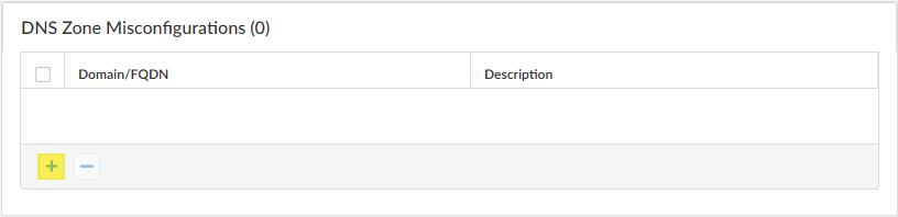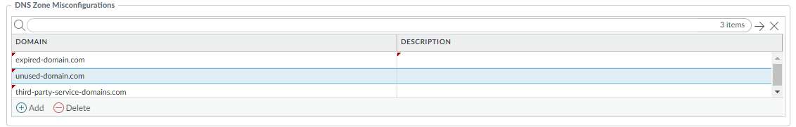 - In the DNS Zone Misconfigurations section, add public-facing parent domains with an optional description to assist you in identifying domain usage or ownership within your organization.Entries must have a "." contained in the domain using the following format (e.g. paloaltonetworks.com), otherwise it gets parsed as a hostname, which is considered a private domain.