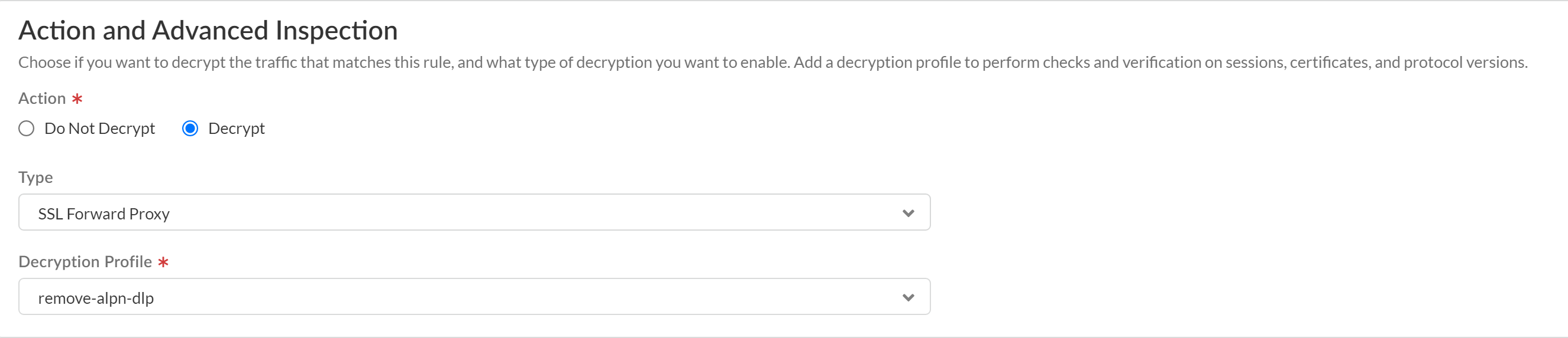 3. In the Action and Advanced Inspection section, configure the policy rule to Decrypt traffic that matches this rule.