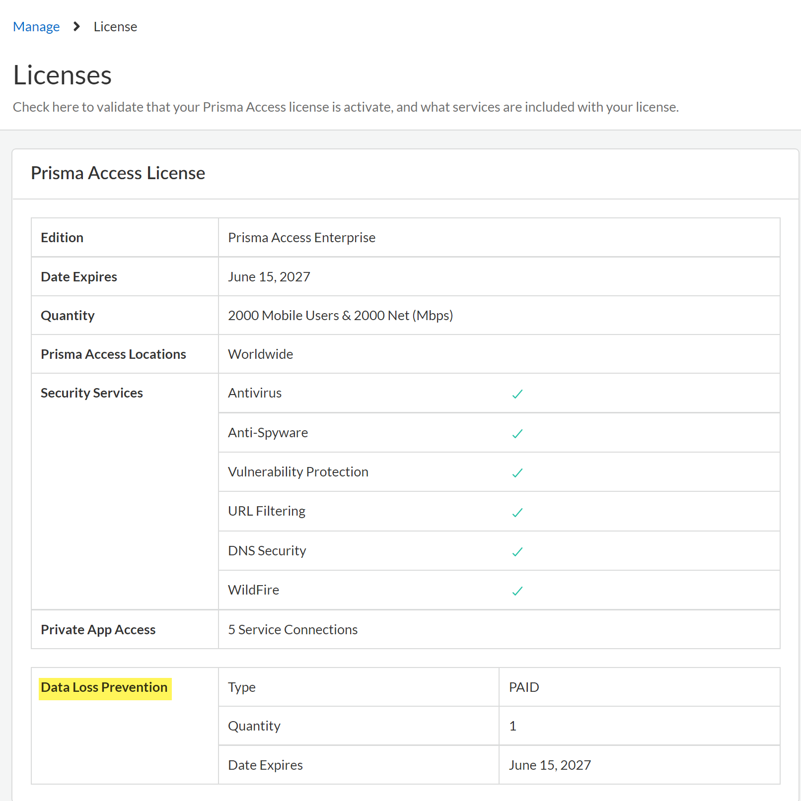 Confirm the Data Loss Prevention license Type displays PAID and that an expiration date is displayed.