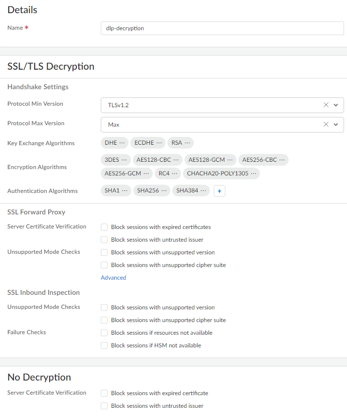 6. Create the decryption profile required for Enterprise DLP to inspect traffic.