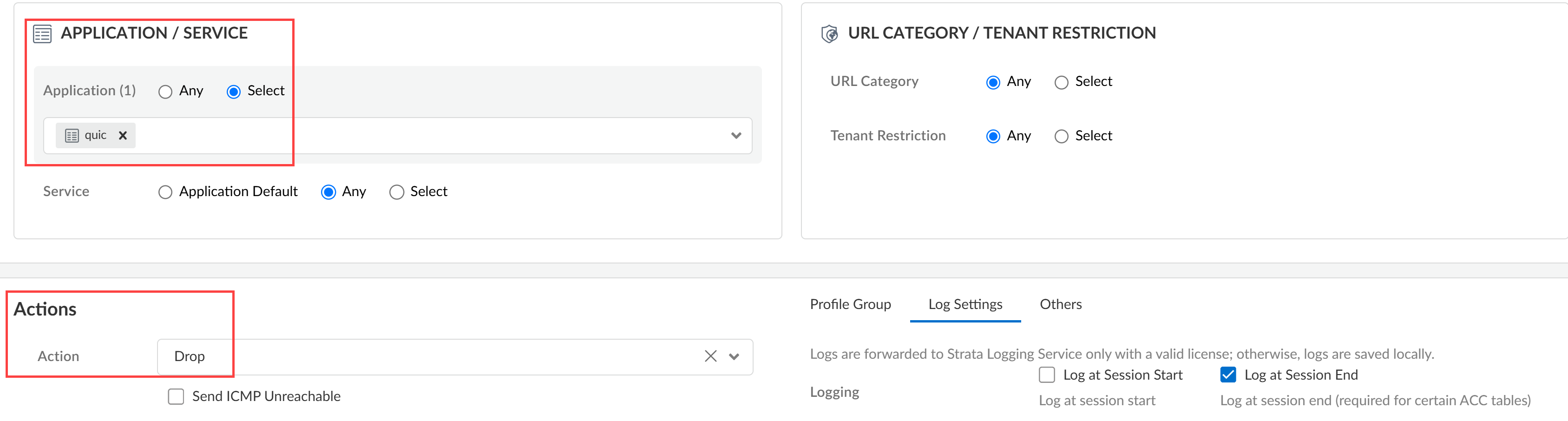 6. Configure the Security policy rule to drop the QUIC protocol.