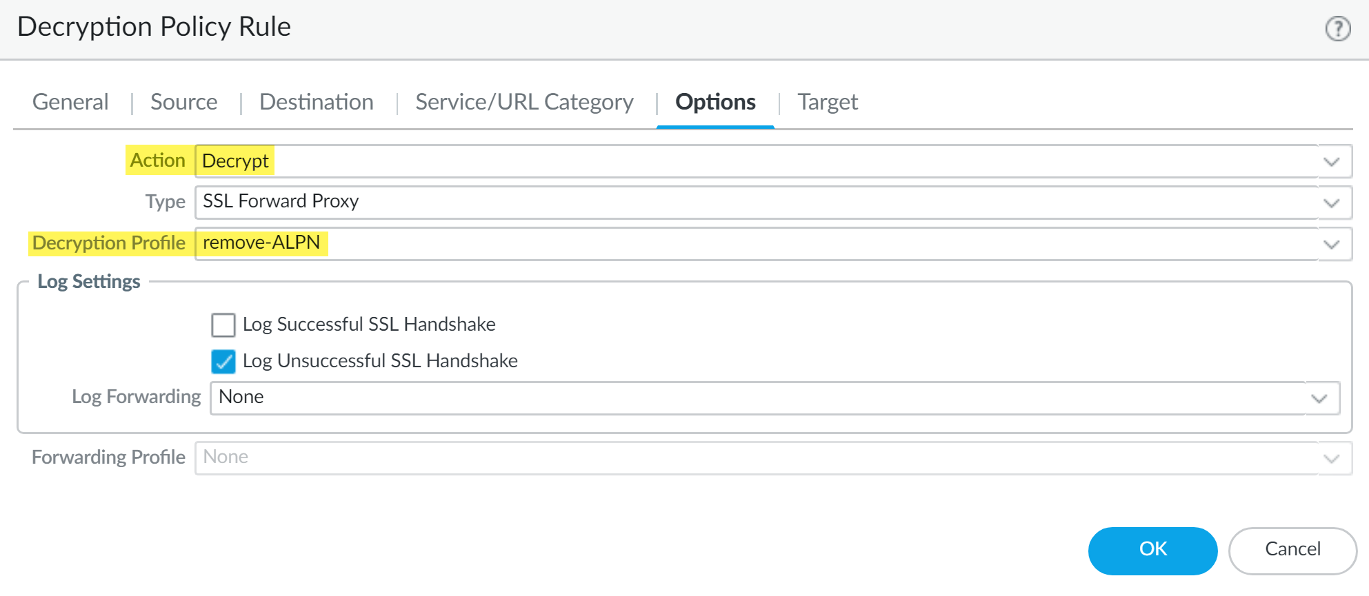5. Select the Decryption Profile you created to strip ALPN headers.