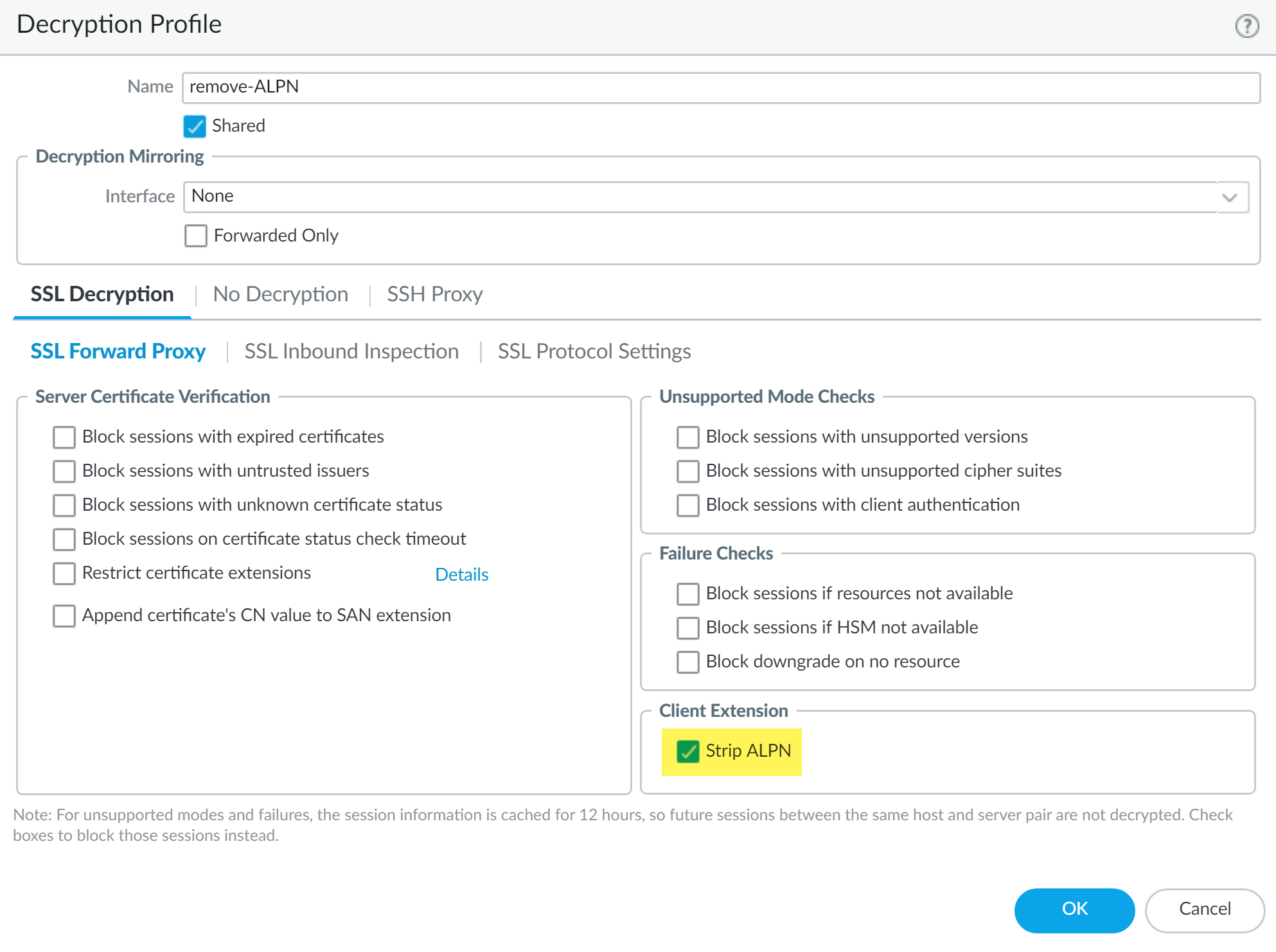 5. Select SSL Decryption SSL Forward Proxy and enable Strip ALPN in the Client Extension.