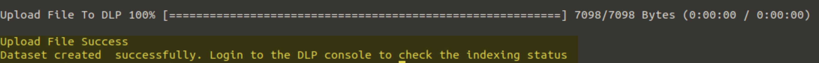 Verify that the EDM data set uploaded successfully to Enterprise DLP.The EDM CLI app displays a progress bar and success message to notify you whether the upload is successful.During the upload process, the EDM CLI app connects to Enterprise DLP to verify that you created the output.zipfile using a supported EDM CLI app version. The upload to Enterprise DLP fails if you created the output.zip file using an unsupported EDM CLI app version.