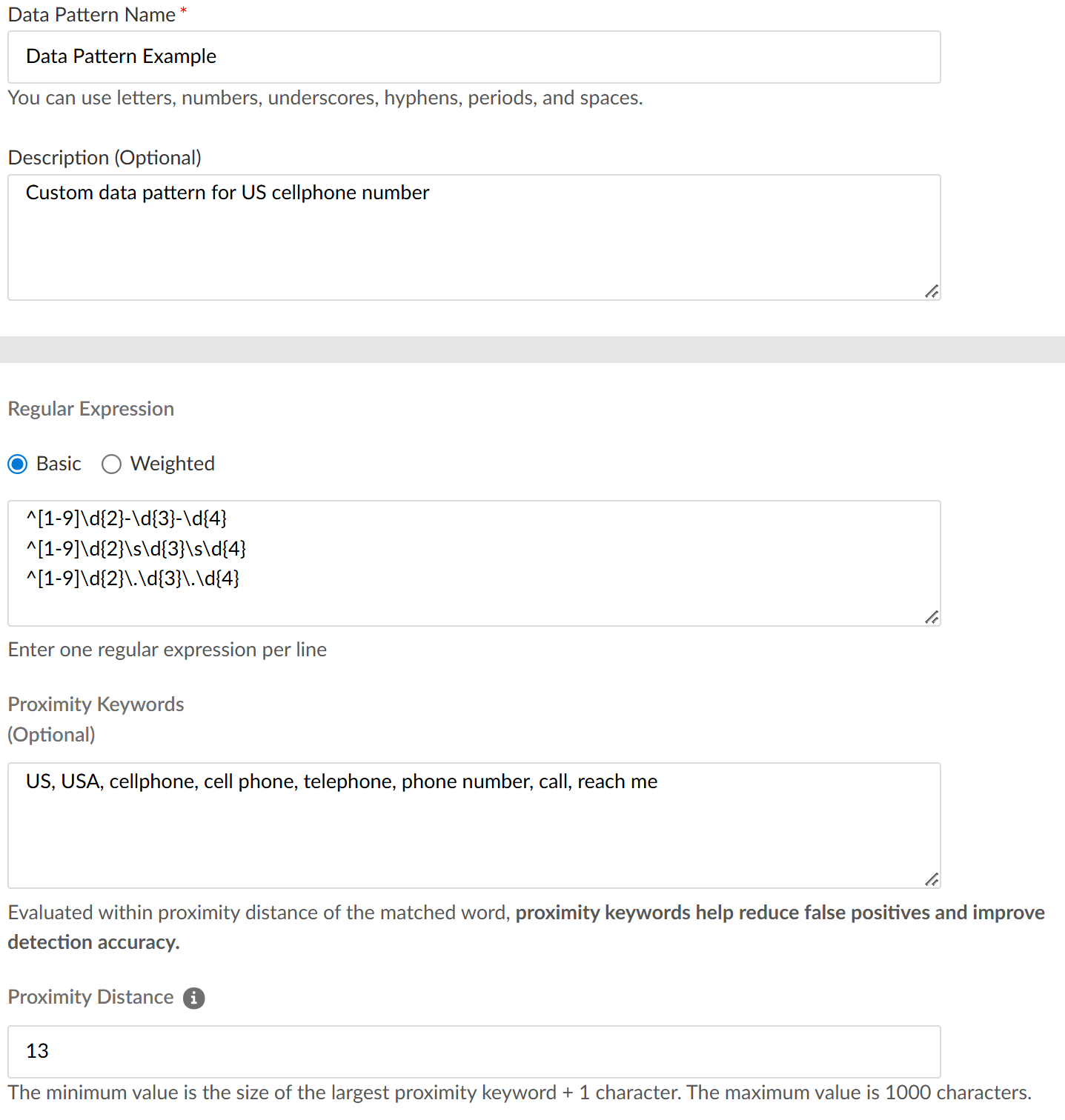 Enter a descriptive Data Pattern Name.If updating an existing data pattern, Enterprise DLP supports changing the data pattern name only if the data pattern isn't currently in use in a data profile or a Data Security (SaaS API) data asset policy rule. You must remove the data pattern from the data profile data asset policy before you change the name. Enterprise DLP prevents you from changing the name if the data pattern is currently in use.Enterprise DLP updates the data pattern name for all DLP incidents with the new archived data pattern name amendment after you archive a data pattern. It takes about10 minutes for the new data pattern name to reflect in the Incident Manager for existing and new incidents.(Optional) Enter a Description for the data pattern.Select the type of Regular Expression.You can choose Basic or Weighted data patterns. Use the Weighted data pattern to create a basic or weighted regular expression. With weighted regular expressions, each text entry is assigned a score and when the score threshold is exceeded, such as when enough expressions from a pattern match an asset, Enterprise DLP will indicate that the asset is a match for the pattern.Then use the query builder in the Regular Expressions field to add either regular (Basic) or Weighted expressions.(Optional) Enter one or more Proximity Keywords.Proximity keywords are not case-sensitive. You can enter one or more proximity keywords to increase the probability Enterprise DLP accurately detects a regular expression match. Proximity keywords impact the Enterprise DLP confidence level, which reflects how confident Enterprise DLP is when detecting matched traffic. Enterprise DLP determines confidence level by inspecting the distance of regular expressions to proximity keywords.Data patterns that don't include any proximity keywords to identify a match always have both Low and High confidence level detections in a DLP incident.(Optional) Enter the Proximity Distance (between 1 and 1,000) to specify the maximum character distance between sensitive data and proximity keywords required to trigger a detection.The default proximity distance is 200.For large files or traffic containing sensitive data where related proximity keywords might be separated by longer text blocks, you can increase the proximity distance to ensure proper detection. Conversely for files or traffic where you need tighter control to reduce false positives, you can specify a smaller proximity distance to ensure only closely associated keywords trigger a match.The minimum proximity keyword distance must be the character length of the longest proximity keyword plus one character. This includes spaces within the proximity keyword value.For example, consider the list of proximity keywords in the custom data pattern below. The longest proximity keyword is phone number which is 12 characters. In this case, the minimum proximity keyword distance is 13.