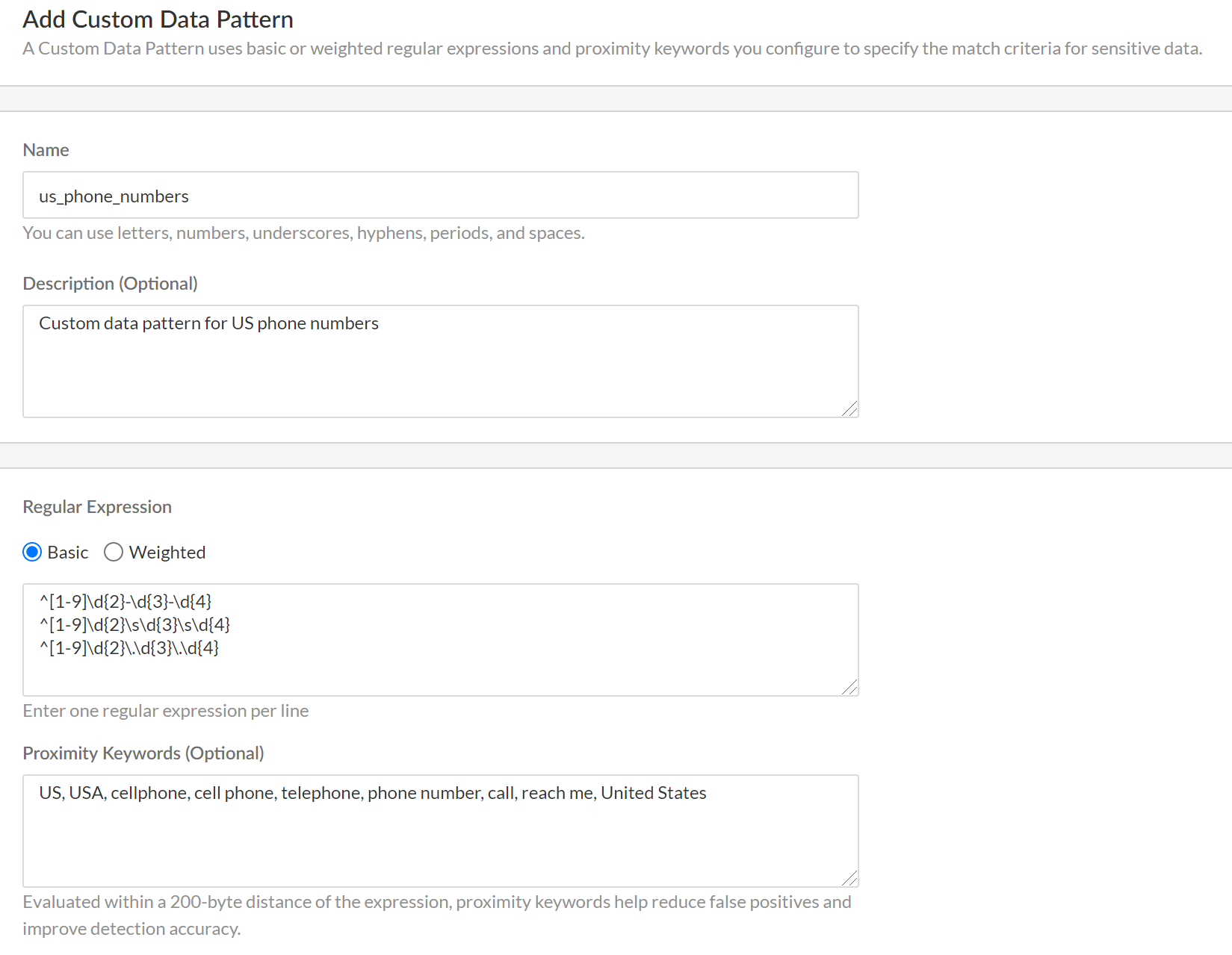 Enter a descriptive Data Pattern Name.(Optional) Enter a Description for the data pattern.Select the type of Regular Expression.You can choose Basic or Weighted data patterns. Use the Weighted data pattern to create a basic or weighted regular expression. With weighted regular expressions, each text entry is assigned a score and when the score threshold is exceeded, such as when enough expressions from a pattern match an asset, Enterprise DLP will indicate that the asset is a match for the pattern.Then use the query builder in the Regular Expressions field to add either regular (Basic) or Weighted expressions.(Optional) Enter one or more Proximity Keywords.Proximity keywords are not case-sensitive. You can enter one or more proximity keywords to increase the probability Enterprise DLP accurately detects a regular expression match. Proximity keywords impact the Enterprise DLP confidence level, which reflects how confident Enterprise DLP is when detecting matched traffic. Enterprise DLP determines confidence level by inspecting the distance of regular expressions to proximity keywords.